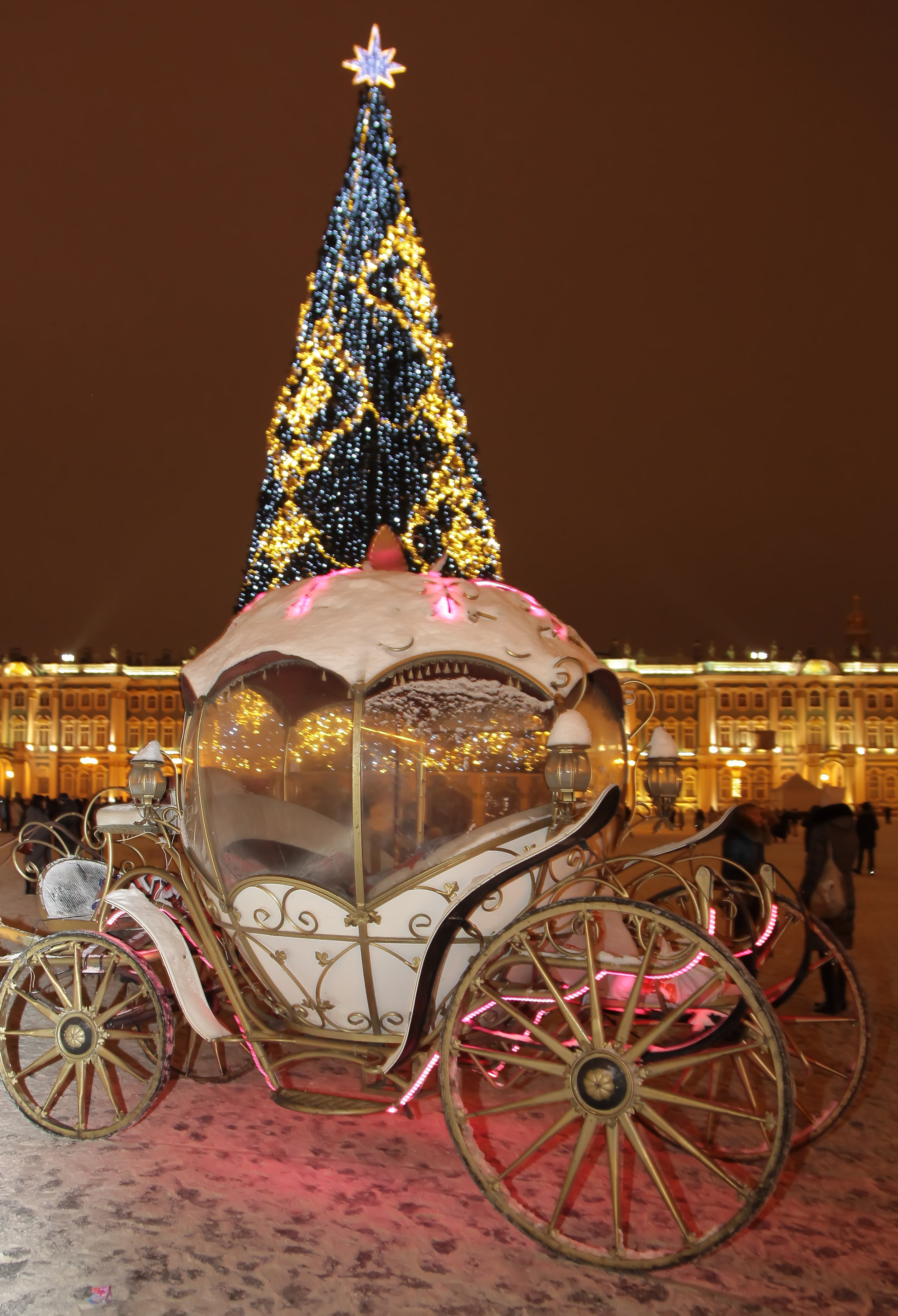 Зимой на Дворцовой площади устанавливают каток и новогоднюю елку. Все вокруг украшено сказочными огоньками. Царит атмосфера радости и праздника, несмотря на пронизывающий ветер и капризную погоду….. я Питер знаю, я там жила!